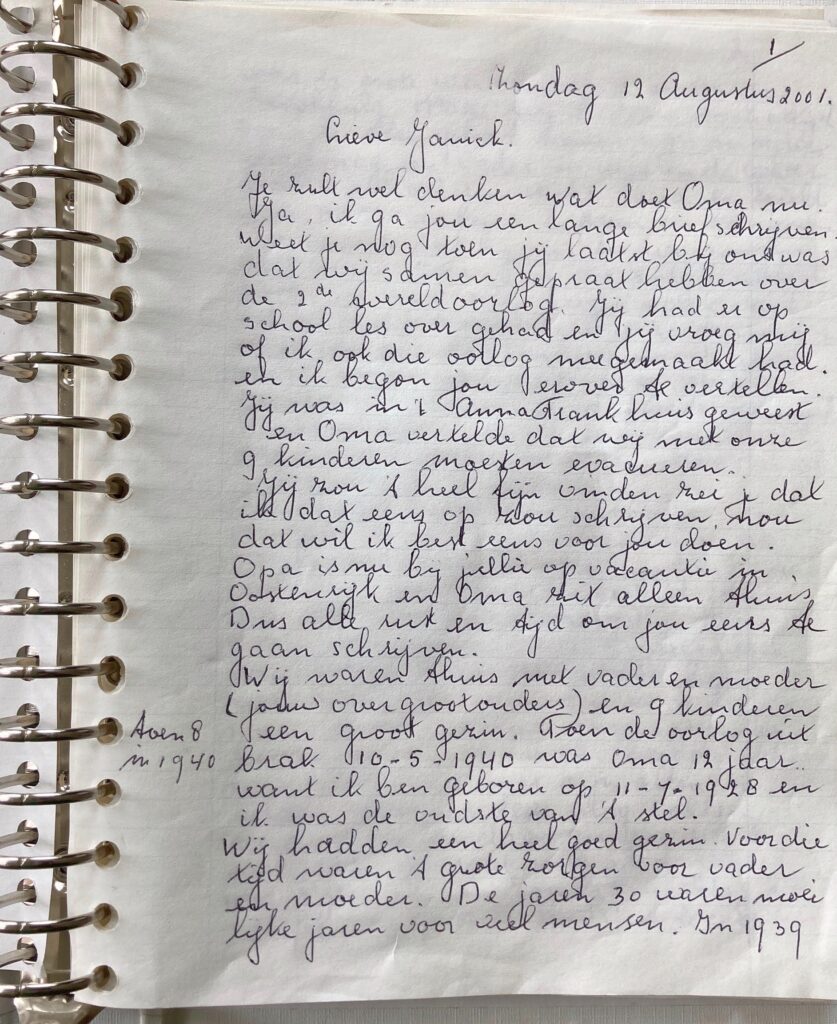 Leida vertelde nooit over de oorlog en de evacuatie. Daarom was het bijzonder dat ze voor Gerry’s oudste zoon Janick haar herinneringen opschreef. Op zijn verzoek, nadat hij op school les had gehad over de oorlog. Gerry: “Dat ze met haar reumahanden het hele verhaal voor hem heeft opgetekend…”